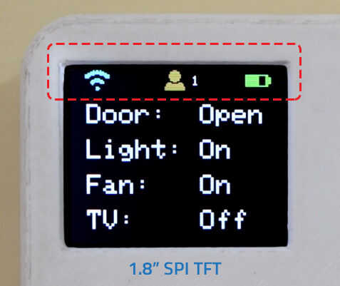 - Imágenes de los iconos de color: depende de la pantalla de TFT usada, para, por ejemplo. 1.8" TFT de SPI con controlador ST7735 tiene 16 bits de color. Imágenes o iconos sólo se ven como la pantalla del teléfono, pero se necesita mucho espacio. tiene 16bits (2bytes) para cada pixel (16times más!).
