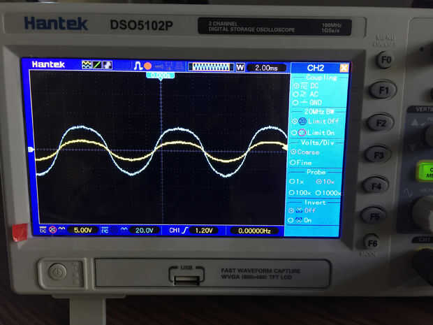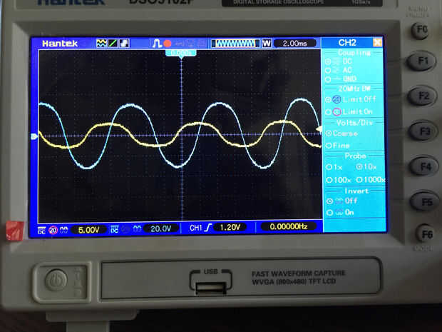 Entonces, tenemos que determinar la ubicación de cada bobina dentro del motor. Sé que sólo podríamos abrirlo y tomar un looksie, pero se trata de: a) no diversión, b) los cables son de pelo fino y el mismo aspecto y c) que ya he encendido un osciloscopio aquí. Enchufe de 1 canal del alcance de un par al azar en polaridad al azar. Conecte el canal 2 a otro par al azar en la otra polaridad al azar. Y ahora, el motor de un leve giro en cualquier dirección. Como me dijo una señora gorda en mi clase de física de 6 º grado, hace girar un imán permanente cerca de un conductor genera una corriente en este conductor, esto es exactamente lo que vamos a ver en el ámbito de aplicación: dos patrones ondulados.