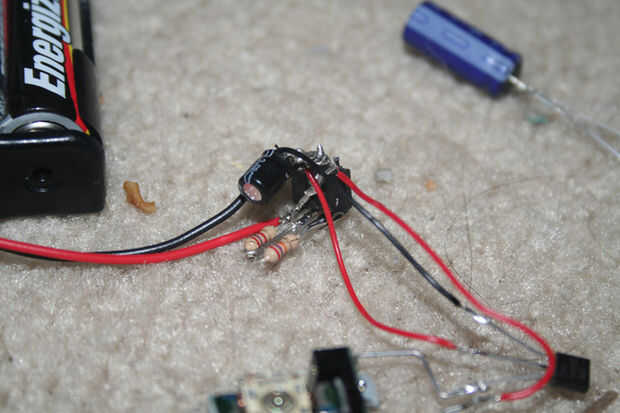 3. soldar el condensador entre los pines 1 y 2, con el lado negativo en el pin 1.