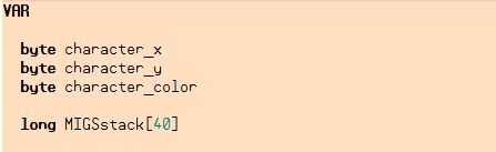 Piense en una variable como una caja de cartón vacía con un nombre escrito al lado de él. Después de definir esta sección como VAR, hemos creado tres"bytes de tamaño", cajas vacías que se denominan character_x, character_yy character_color. Porque son tamaño byte estas cajas pueden contener cualquier número decimal hasta 255 (un solo byte de información).