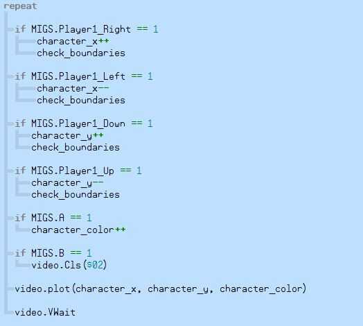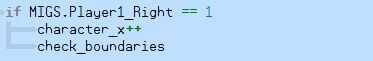 Un si la declaración es una comprobación de estado. La declaración si MIGS. Player1_Right == 1 comprueba si se pulsa el botón derecho sobre el dispositivo de juego. Cuando pulsa el botón no está siendo lo generalmente informa un 0. La tecla 1 es visto por el if condición check. ¿Observe cómo las dos líneas se sangran nuevamente más allá de la fi comunicado? Esto significa que si se pulsa el botón derecho en el controlador, se ejecuta el comando character_x ++ y check_boundaries.