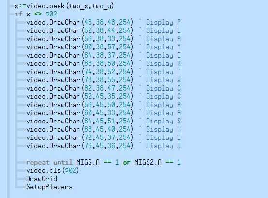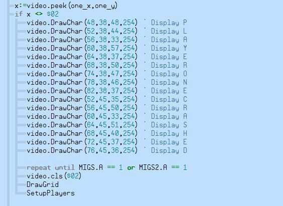 Si encontramos que el espacio contiene un color que no sea de $02 {si x <> $02) entonces sacamos un montón de letras en la pantalla. (El código que en sangrado por debajo de la instrucción if de la condición.