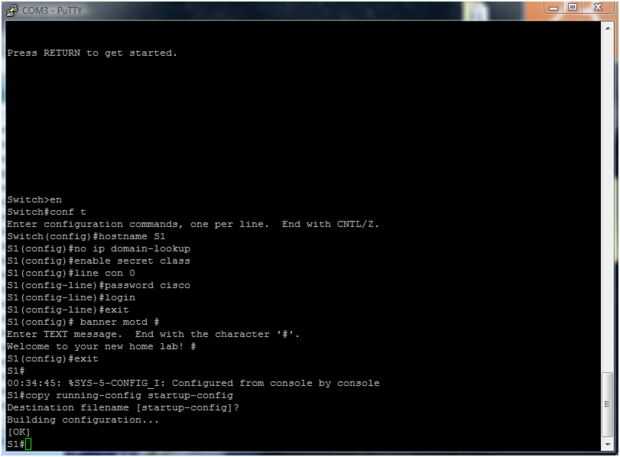 1) estos pasos le muestran cómo nombre, prevenir no deseados de las búsquedas DNS, establecer una contraseña, escriba un mensaje del día (MOTD) y guardar la configuración en NVRAM para interruptor 1.