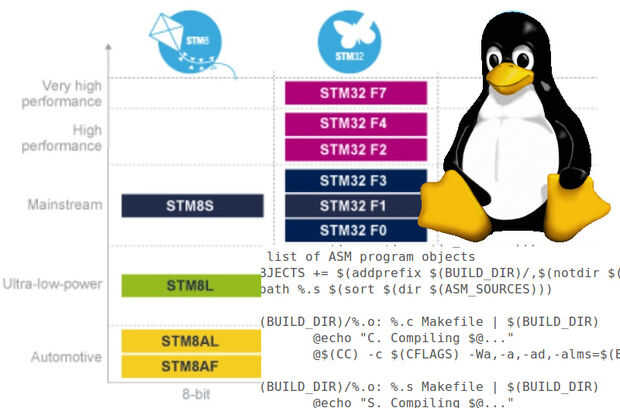 La STM32Fx y STM32Lx son microcontroladores basados en arquitectura ARM. Para la construcción de programas es el compilador gcc disponible bajo GNU/Linux. El compilador gcc tiene muchos ajustes y banderas, por lo que no es tan fácil construcción proyecto de tamaño medio.