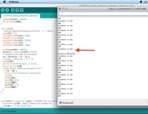 Como parte del código hemos puesto umbral de detección de obstáculo a 10 cms, para probar que tu robot se detiene y se mueve izquierda coloque usted mano o un objeto en frente, y en el monitor serial debería ver el obstáculo detectado como se muestra en la foto de arriba.