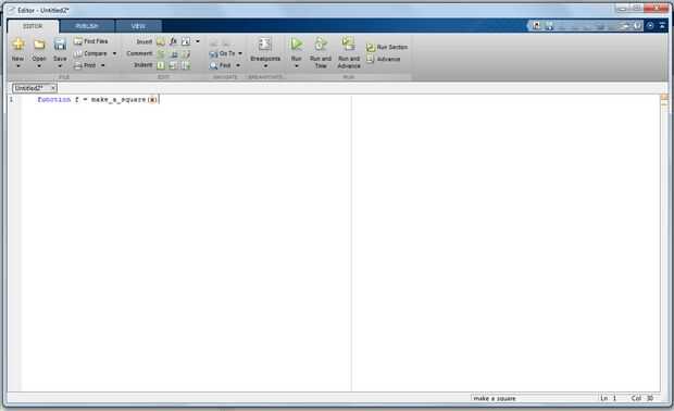Una vez que se abre la ventana de comandos, escriba "función f = make_a_square(x)" en la línea 1. La palabra "función" le dice a MATLAB que este script sea una función. El texto entre la palabra "función" y el = significa la salida de la función, siendo en este caso "f". El texto dentro de los paréntesis indica la entrada, en este caso es "x". Por último, el texto directamente a la izquierda del paréntesis es el nombre de la función, que en este caso se llama "make_a_square."