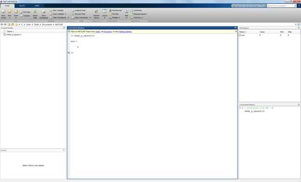 Volver a la ventana de comandos. Escribe "make_a_square(3)" y pulsa Enter en tu teclado para probar la función. El código debe cuadrado el número 3, salida 9. Si el código no hace esto, revise para asegurarse de que usted escribe la función correctamente en la ventana de comandos. Si esto no resuelve el problema, abrir su función en la ventana Script y asegúrese de que no hay ningún error. Una vez código es salir correctamente, habrá creado con éxito su primera función MATLAB!
