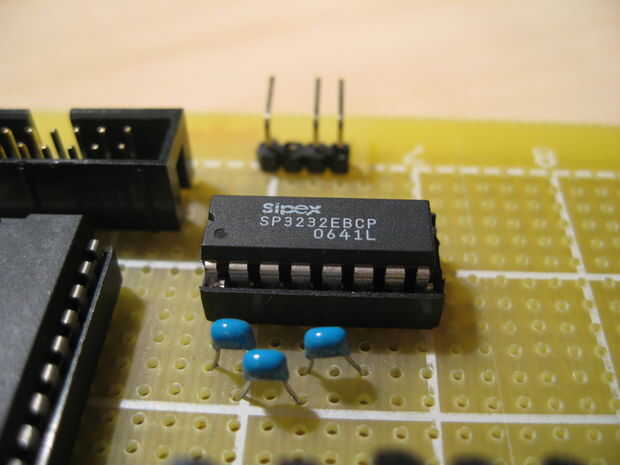 Para convertir la serie de señales desde el micro controlador a algo RS232 puerto de una PC puede comprender, y viceversa, utilizamos el IC MAX232 de Maxim. En realidad, el chip que estamos usando no es de Maxim, pero es un clon de perno-compatible.