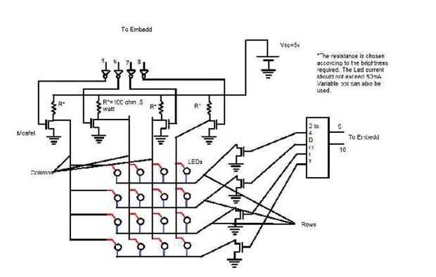 El circuito que se muestra explica la conexión para una matriz de LED de 4 por 4, el circuito es similar a la del circuito real de 8 por 8 pero el arreglo no está en el patrón de estrella, este circuito se realiza sólo por la comprensión y el mismo circuito se puede ampliar a la 8by 8 LED estrella patrón que consta de 64 LED usando MOSFETs más 8.