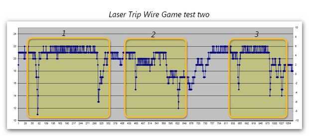 - Usted puede ver una diferencia en la escala de los dos gráficos, el gráfico de un juego se extiende 60 milisegundos mientras los milisegundos de tabla sólo 14 2 juego - he puesto esto a la posibilidad de que los espejos deben haber movido ligeramente durante el primer juego (muy posible ya que es un suelo laminado que ha flex un poco en él debido al aislamiento debajo de él. Esto dio lugar a una menor respuesta del sensor, pero aún legible. No he incluido el diferencial esta vez que oculta los datos de ejecución.