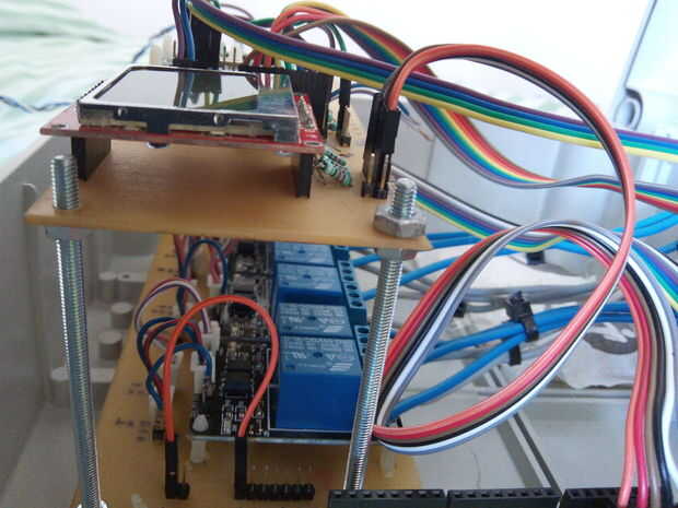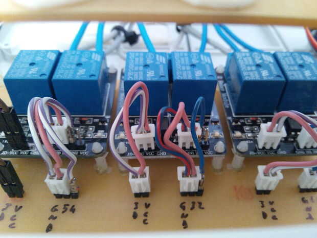 Soldar los puentes y los encabezados de pin en la pantalla del relé. Coloqué los pines del conector relé a izquierda y derecha de la pantalla, así que usted puede elegir conectar el piso sobre el lado que desee. Ahora Conecte los tableros de relés con los espaciadores de plástico. Usted encontrará que este arreglo es bastante fácil de manejar. Por fin tomar el escudo de los sensores y el zócalo de 8 pines de soldadura. Luego siga el portapilas (mantener un ojo a + y -). Ahora soldar los conectores verdes, que le permitirá conectar sensores analógicos externos eventual.