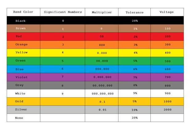 Es la banda de color de voltaje en los condensadores, pero no todos los condensadores tienen un voltaje marcado y no todos los tipos de condensador tienen la clasificación de la misma tensión. Así que el código de color de la tensión de un grupo de condensadores tendrá diferentes valores desde el código de color de voltaje de otro grupo de condensadores. La tensión nominal es la tensión máxima que puede aplicarse a un capacitor antes de que comience a romper.