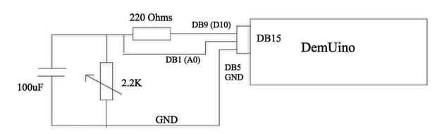 Considerar en primer lugar, como una prueba de aplicación del concepto de la unidad de DemUino, el siguiente circuito simple aplicar el equivalente de un circuito de pwm controla la salida de una fuente de alimentación.