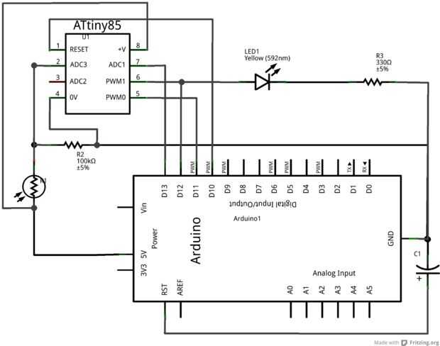 En primer lugar, añadir la pata corta del sensor de luz a VCC y largos de la pierna al ATtiny pin 2 (D3). Confundirse a estos números, especialmente cuando comienzas a hablar sobre pines analógicos. En este caso, el pin analógico 3 es igual a pin digital 3, por lo que lo hace un poco más fácil a menos que empieces a creer A2 y D2 son iguales (no son). También es necesario conectar el resistor de pull-down de D3 a GND.