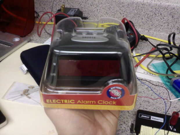 Este es el reloj que elegí. Lo conseguí en Walmart y es barato por lo que si fui capaz de usarlo, yo no sería demasiado molesto. También tiene una batería de 9v en caso de que se vaya la electricidad. Más tarde me enteré la secuencia de alarma desde el ATMega168 todavía se apaga! Por lo que se aún despertar si no hay ninguna energía! Cuando está en funcionamiento de batería apagar la pantalla frontal y cambia a un reloj interno diferente que es menos precisa pero todavía funciona bien. Cuando se reconecte la alimentación el reloj puede tener que ajustar pero la configuración de la alarma permanecerá.