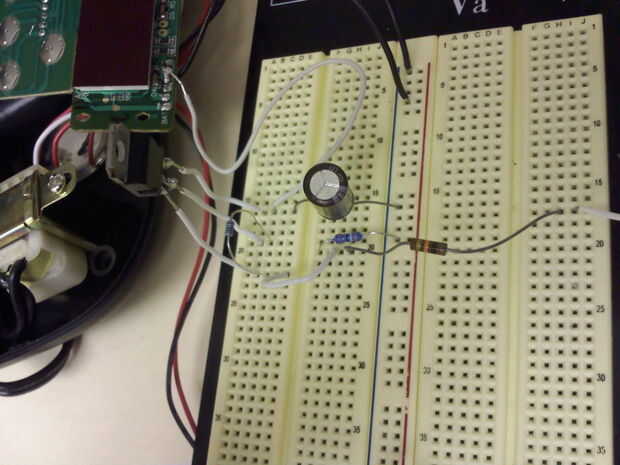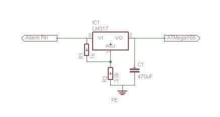 Que soldar un cable a tierra y en el pin de alarma y comenzó a trabajar en un circuito de constante a la tensión. Pensé que podía usar un regulador de 5v pero sólo tenía un regulador ajustable poniendo alrededor. Hice algunas matemáticas y mis valores proporcionan un voltaje ligeramente por debajo de los 5v. Yo ocupada vanamente un poco e intercambiar resistentes hasta que proporciona 5v necesitaba. Usé un condensador de 470uF en la entrada para suavizar la tensión. Con el condensador, la tensión sólo varió de 10.5v-10v. A continuación es el esquema del circuito que usé para mi salida de la alarma de la condición y una imagen de las partes juntas en un protoboard.