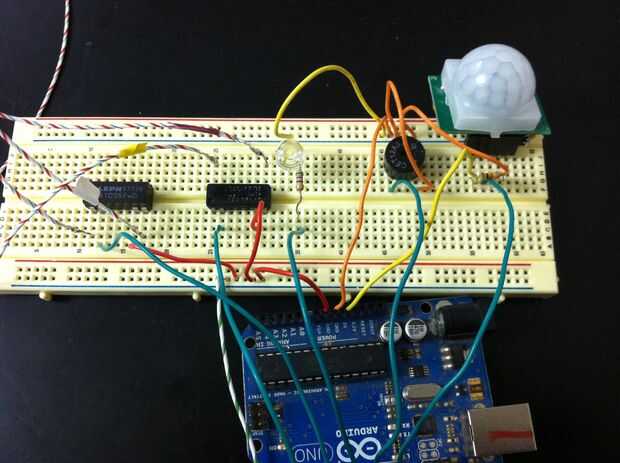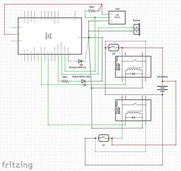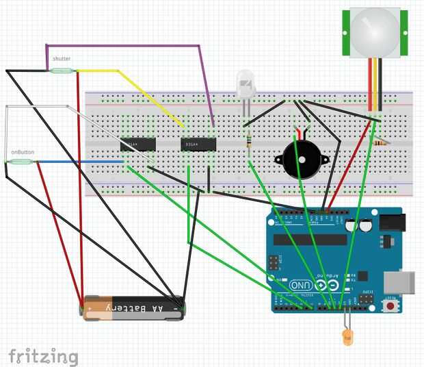 Ahora para la diversión parte! El tablero de anotación y diagramas esquemáticos le ayudará a comprender cómo todo encaja (nota que la anotación para el diagrama esquemático se concentra en la parte izquierda de la imagen). También he incluido una foto de mi Asamblea real para la comparación. En el protoboard y diagramas esquemáticos, usted notará que verde conecta componentes a las entradas digitales del Arduino, cables rojos conectan componentes a una fuente de voltaje positivo, y los cables negros van a tierra. El azul, blancos, amarillo y morados los cables que se conectan los interruptores de la cámara a los dos relés de 8-pin DIP representan esos mismos cables en la fotografía actual (donde los colores corresponden a la cinta aislante de color de cada cable). Los tres cables el sensor PIR ilustran la salida de 5V (rojo), (amarillo) y tierra (negro) orden de los pines en el modelo PIR que utiliza. Tenga en cuenta que a diferencia del diagrama, necesitaba un perno jefe capaz de pila para sujetar mi PIR a la protoboard.