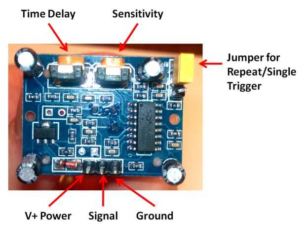 La demora por defecto para el gatillo de repetición es de 2,5 segundos. Esto se puede ajustar hasta aproximadamente 5 minutos girando el tornillo de sincronización hacia la derecha o abajo a tan bajas como 0,3 segundos hacia la izquierda. Asimismo, la sensibilidad puede ajustar hacia arriba girando el tornillo de sensibilidad hasta aproximadamente 7 metros y disminuida girando el tornillo de sensibilidad hacia la izquierda hasta unos 3 metros.