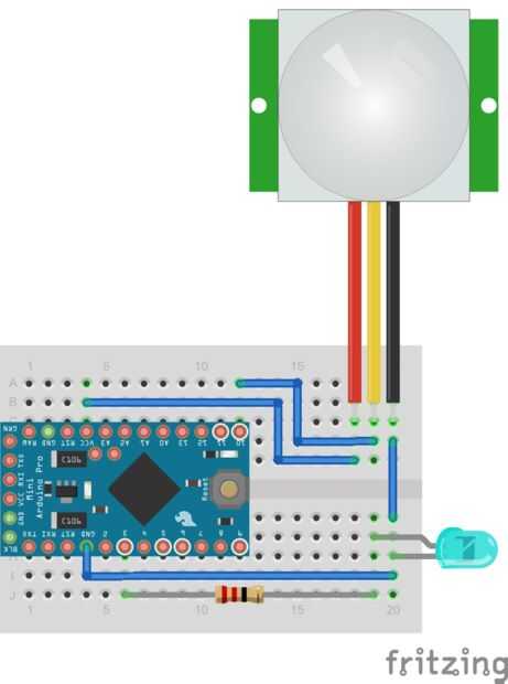 Se necesita conectar el LED y PIR sensor a la placa Arduino. El sensor de PIR que usé tiene el pasador central como la señal, de la izquierda para la fuente de 5V y para tierra. La línea central de alambre al pin digital 10 y el poder y las líneas de tierra del PIR a 5 V pin y a la GND pin en el Mini Pro.