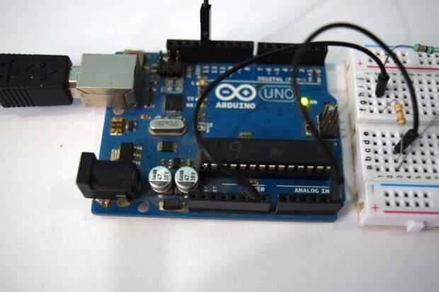 int inPin = 5; // analog 5 int val = 0; // where to store info from analog 5int pin11 = 11; // output of red ledvoid setup() { Serial.begin(9600); }void loop() { val = analogRead(inPin); // reads in the values from analog 5 and //assigns them to val if(val >= 1){ val = constrain(val, 1, 100); // mess with these values val = map(val, 1, 100, 1, 255); // to change the response distance of the device analogWrite(pin11, val); // *note also messing with the resistor should change // the sensitivity }else{ // analogWrite(pin11, val); just tuns on the led with // the intensity of the variable val analogWrite(pin11, 0); // the else statement is just telling the microcontroller // to turn off the light if there is no EMF detected } Serial.println(val); // use output to aid in calibrating } El código no es lee el voltaje en el pin analógico y se enciende el led si se alcanza un cierto voltaje del umbral. Así que el LED se enciende cuando usted trae el dispositivo cerca de una red eléctrica.
