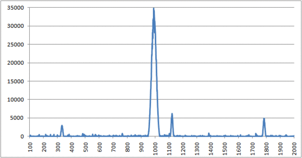 El diagrama a continuación muestra el resultado del algoritmo para un barrido de frecuencia donde la amplitud de la señal de entrada era lo suficientemente grande para recortar la forma sinusoidal. Tenga en cuenta los picos adicionales en la respuesta. La frecuencia de la blanco fue aproximadamente de 1000Hz y la frecuencia de muestreo es 4400 Hz. Nota la espiga corta en la respuesta justo por encima de 1100Hz. El tercer armónico de esa frecuencia es aproximadamente 3400Hz, que para una frecuencia de muestreo de 4400Hz alias como 1000Hz.