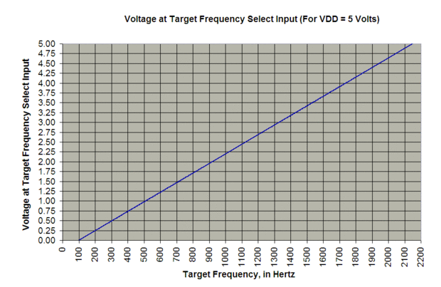 Así que, para una frecuencia objetivo de 1000Hz y la VDD de 5 voltios, el voltaje aplicado a la frecuencia de seleccionar entrada debe ser: