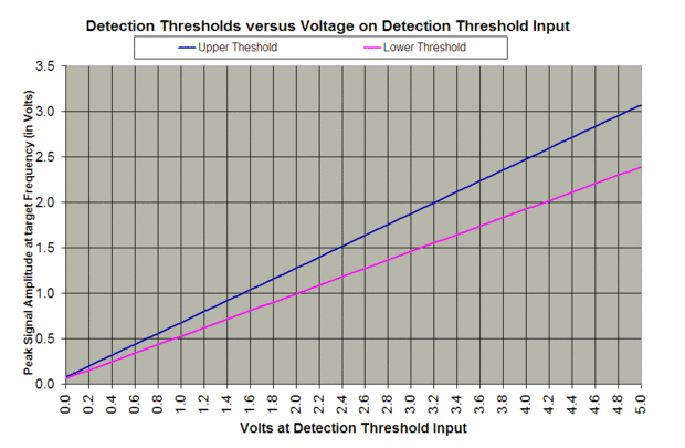 Frecuencias situadas fuera de la meta producirá una disminución en la respuesta del algoritmo. Así que, si se establece el umbral de detección para detectar una señal de entrada de 1 voltio o más en exactamente la frecuencia de la blanco, una señal ligeramente fuera de la frecuencia objetivo necesitará de mayor amplitud para ser detectado. La respuesta del algoritmo es nítida, incluso señales de gran amplitud que están muy lejos fuera de la frecuencia objetivo producirá poca o ninguna respuesta. Consulte los diagramas de respuesta algoritmo versus frecuencia en otros pasos.