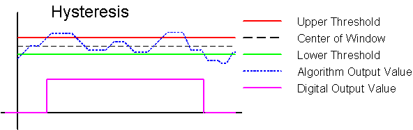 El valor leído de la entrada de ajuste de umbral establece el valor del centro de una ventana de histéresis con los umbrales superiores e inferiores sentado simétricamente sobre y debajo del centro. El valor de salida del algoritmo debe superar el valor umbral superior para provocar la salida de detección ir alta, y el valor de salida debe caer por debajo del umbral inferior antes de la salida de detección será baja. Las más pequeñas variaciones en el valor de salida anterior y por debajo del centro de la ventana hacen que la salida de detección cambiar.