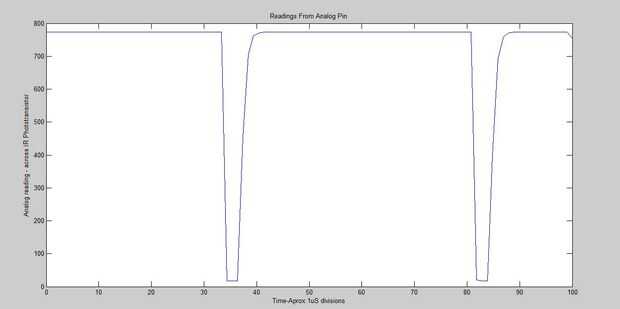 El código de Arduino lleva 100 lecturas desde el fototransistor IR (lectura tomada aprox cada 100uS) y el uso de este, determina si esta señal contiene la frecuencia.