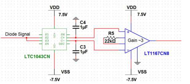 La primera etapa de los circuitos de acondicionamiento de señal es el amplificador de instrumentación de muestreo y retención. Durante cada ciclo de reloj, el bloque de edificio de condensador conmutado cambiará su salida a cada una de las entradas del amplificador de instrumentación. Esas entradas tienen condensadores pequeños con el fin de sostener su valor hasta que se actualizarán el próximo ciclo de reloj. Durante la parte ON el ciclo de reloj, el LTC1043CN empujará la señal del fotosensor a una salida, y durante la parte de apagado del ciclo del reloj presionarán el valor a la otra entrada. Esto proporciona un valor base de la luz ambiental para el amplificador de instrumentación comparar el valor de luz LED, mejorar la SNR. Es importante que los carriles de alimentación del amplificador de instrumentación debidamente desconectados. Un montón de ruido de 2 kHz puede entrar en él desde el generador de reloj de LTC1043, que sería amplificado por esta etapa si no se desemparejan correctamente.