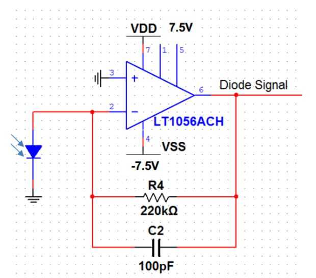 Cuando con la luz, el fotosensor actúa como una fuente de corriente. El op-amp se configura como un amplificador de transimpedancia limitado ancho de banda, proporcionando un voltaje a los circuitos de acondicionamiento de señal. Cuando hay diferentes cantidades del volumen de sangre en el dedo el fotosensor detecta diferentes cantidades de luz, proporcionando una señal cambiante en sincronía con pulsaciones de sangre.