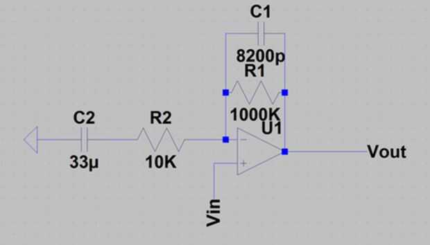 La siguiente etapa de los circuitos de acondicionamiento de señal es un filtro de paso alto con un corte de .1Hz en uno de lo op-amp de la LT1112. Esto actúa como un bloqueador de DC, facilitando el trabajo con en el resto de la ruta de señal de la señal.