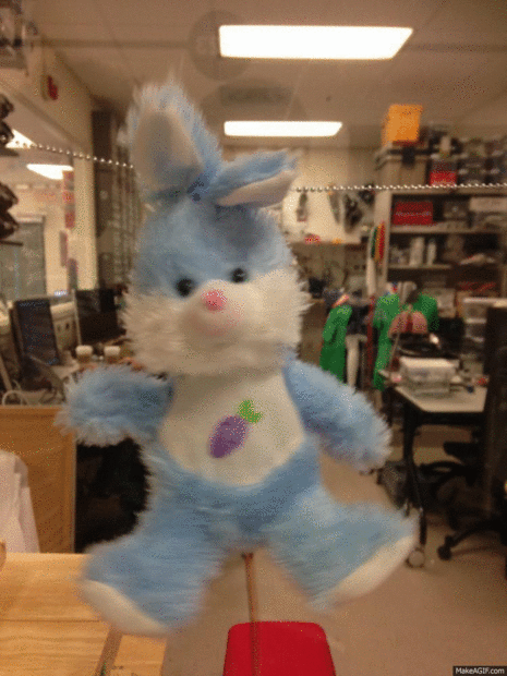 En uno de mis proyectos en la clase CMSC838F en la Universidad de Maryland (impartido por el Prof. Jon Froehlich), ponemos un conejito de peluche en la ventana del laboratorio, y usando el Microsoft Kinect, personas que pasaban por la ventana de la pista y moverse al conejo que se encuentra frente a ellos. Este proyecto fue inspirado por http://www.niklasroy.com/project/88/my-little-piec....
