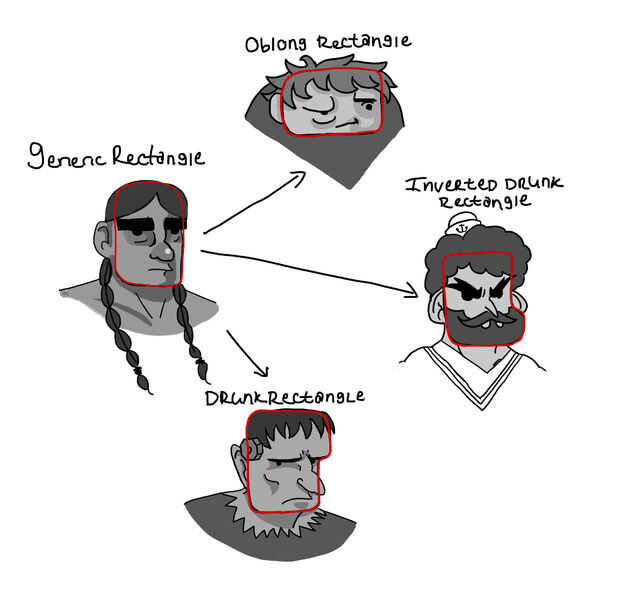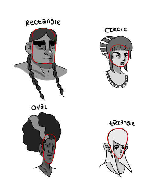 Hay también subdivisiones de estas cuatro categorías, que se pueden ver en las fotos que adjunto. Un círculo, por naturaleza, no se puede modificar o ya no es un círculo, por lo que obviamente no son variaciones de aquél. El óvalo es un poco más flexible y cuando digo esto, me refiero a que usted puede girar hacia los lados. Está sobre él. Si se dobla se convierte en un blob, no ya de un óvalo. El rectángulo por el contrario, sigue siendo un rectángulo si sigue las leyes que indicado arriba, por lo que son probablemente 1 millón. He incluido tres basicos que se derivan de la rectángulo genérico: Rectángulo oblongo, Rectángulo borracho y finalmente el invertido borracho rectángulo. Estas son buenas para distintos looks. Por ejemplo, el rectángulo borracho da la impresión de una frente saliente, lo que implica que su carácter es sordo o cruda, como un hombre de Neandertal. La cabeza rectangular sí mismo es buena para personajes que pretenden salir tan fuerte, probablemente debido a los ángulos agudos. Recuerde que aunque las normas casi siempre pueden ser manipulado, no hay ningún libro de la regla diciendo que General Fancypants de la resistencia Imperial no puede tener un débil, goteo de la barbilla y las mejillas regordetas, o poca Barreta con apoyos, jugar YugiOh! no puede tener una mandíbula mucho más aguda que cualquier Spielberg quijadas dirige.