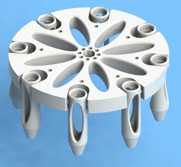 Rotor (Paso 6): el rotor es la parte de la centrifugadora que gira y asegura los tubos que contienen la muestra durante la operación. El rotor será de un máximo de ocho tubos de 15mL. Los tubos son cargados en el rotor en los soportes que gira para que, cuando la centrífuga está en reposo, los tubos cuelgan de manera vertical, y durante el funcionamiento, los tubos están radialmente, paralelo a la dirección de la fuerza centrípeta ejercida sobre ellos. El rotor debe ser bastante fuerte para sostener los tubos de muestras bajo las fuerzas centrípetas generadas a la máxima velocidad de giro de la centrífuga, además de un generoso margen de seguridad.