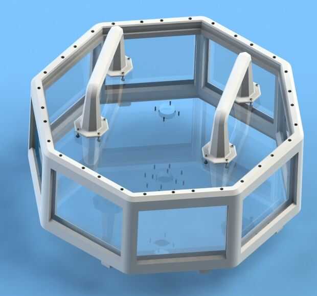 Caja de seguridad (Paso 7): el gabinete de seguridad contiene todas las partes móviles de la centrifugadora, excepto el motor. El recinto está diseñado para hacer dos cosas. En primer lugar, la caja impide cualquier objeto extraño la centrífuga durante la operación. En segundo lugar, el recinto es un escudo diseñado para evitar que cualquier parte de la centrifugadora, o los tubos de muestras, siendo expulsado de la máquina en caso de falla. El recinto está diseñado para proteger al operador de la centrifugadora y cualquier otra cosa que podría sufrir daños causados por un fallo mecánico de la centrifugadora.