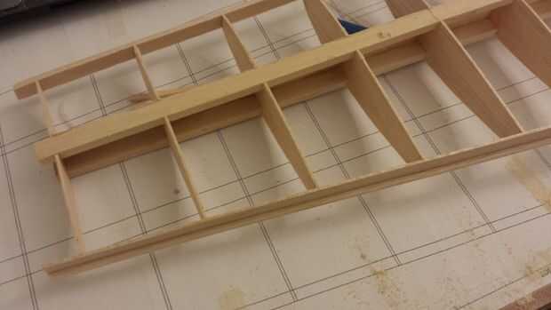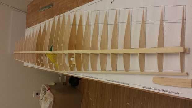 - Coloque una regla entre los segmentos de spar de arrastre en cada ala y marcan todas las costillas del centro, donde se instalará el spar de arrastre central. Proporciona la estructura necesaria para montar el fuselaje al ala.