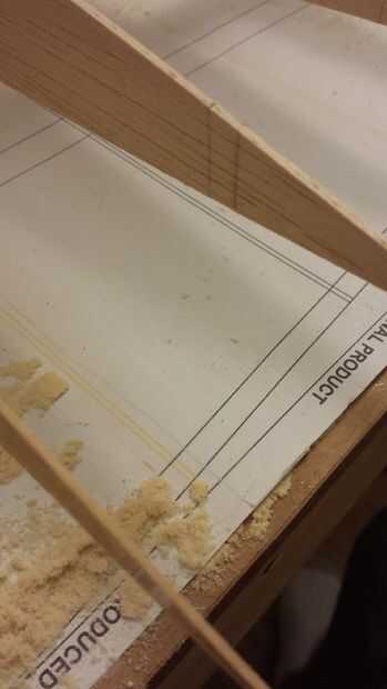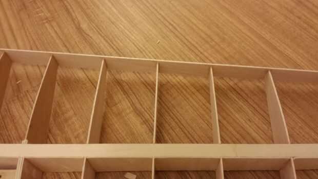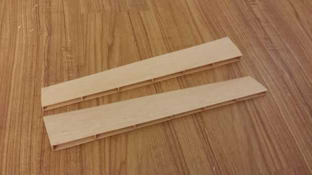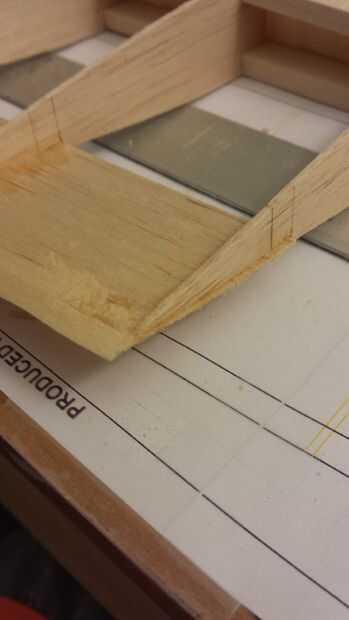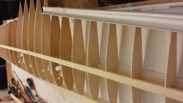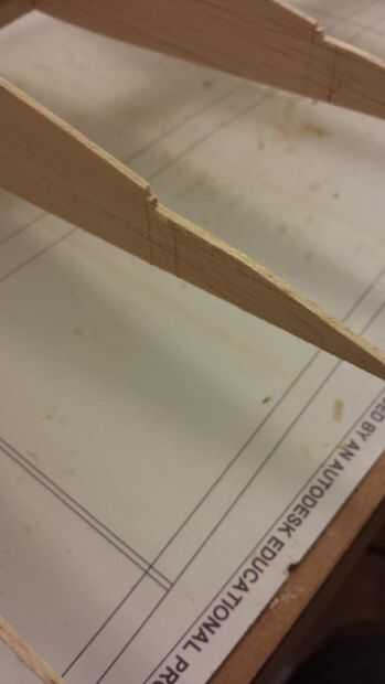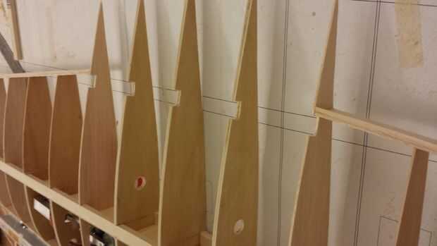 - Corte las muescas del larguero de las costillas con una sierra de maquinilla de afeitar, haciendo varios cortes hacia abajo y luego rompiendo el material entre ellos, el más cercano los cortes más fáciles que sea. También asegúrese de que el mástil de arrastrar todo está dentro de las costillas. Esto puede requerir la salida de costillas a ser un poco más profundos por el diedro del tablero.
