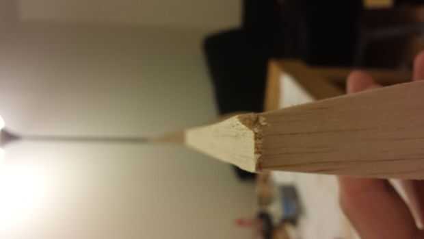 - Fije el tamaño arrastrar mástil hecho de una tira de 1/16" espesor balsa en el borde de fuga del ala con gruesa CA.