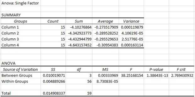 Existen algunas piezas importantes de información que cuenta con este procedimiento. En primer lugar, el ANOVA sólo compara las medias de los grupos. Elegir un solo factor ANOVA implica que hay solamente un factor en la variación de la media de cada grupo (es decir, una variable independiente, en este caso, la corriente). En segundo lugar, estamos llevando a cabo el ANOVA para tratar de rechazar la hipótesis nula. La hipótesis nula predice que la variación en los datos es el resultado del azar y que no existe una relación distinguible entre la tensión de alimentación del electroimán y la resultante fuerza de frenado. En tercer lugar, el valor de alfa representa el nivel de confianza en el que se ejecuta la prueba. Un valor de 0.05 significa esencialmente estar 95% confiado en nuestra conclusión. (Realmente significa que hay una probabilidad de 5% se acepta la hipótesis nula cuando es realmente falsa o rechazarla cuando sea verdad).