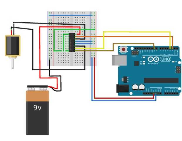 Si usted quiere ser capaz de probar más niveles de tensión, un puente h es una simple adición. La regleta puede utilizarse para transmitir la potencia a un puente h como se muestra en la imagen. Generalmente, se utilizan puentes HS con robots para controlar la velocidad y la dirección de motores de corriente continua simple. Para nuestros propósitos, necesitamos solamente la parte de modulación del puente h (realmente vamos a usar los controles de pwm de Arduino, pero el puente h es un medio por el cual podemos aplicar los controles PWM a la venida actual de la pared). Un esquema del puente h que usé en la foto. Tenga en cuenta que es un duelo h puente, por lo que solamente utilizaremos la mitad de las clavijas. Los pines se numeran a partir de 1-16 en la esquina superior izquierda y moviéndose hacia la izquierda. El pin 1 es el pin enable que se conectar al pin 9 en el Arduino. Si el pin 1 es bajo, se detiene el flujo de poder todo. Además, el pin 1 es capaz de leer una señal PWM que se utilizará para la modulación. Pines 2 y 7 están conectados a los pines 3 y 2 en el Arduino, respectivamente. Estos se utilizan para controlar la dirección de la corriente que no va a cambiar para nuestros propósitos. Esencialmente, cuando uno es alto y la otra es baja, la corriente fluye en una dirección fija y se invierte cuando el pin dice cambio. Pines 3 y 6 sirven como la salida y se conectan a la regleta de conexiones que, a su vez, está conectada con el electroimán. Ambos pines 4 y 5 están conectados a tierra en el protoboard. Los pines 9 y 16 están conectados a la energía de 5v. Por último, el pin 8 está conectado a la fuente de alimentación (regleta). La tierra de la fuente de alimentación debe conectarse a tierra en el protoboard. En el diagrama de cableado, la batería de 9v representa lo que sería la fuente de alimentación conectada a la regleta de bornes mientras que el solenoide representa el electroimán conectado en la regleta. El código para utilizar el puente h es muy simple, aquí es uno de mis bocetos (se adjunta el archivo):