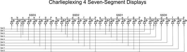 Charlieplexing no es sin complicaciones. En este punto, observe que los cátodos de SSD2 y SSD3 H porque ellos también están conectados a Sel2 y Sel3 respectivamente. Ánodos del segmento "a" LED están conectados a Sel0 que actualmente es L. Así, el segmento "a" LED son sesgo en invertida. Aunque esta condición no causa a iluminar, es importante entender que los LEDs están sometidos a (y deben ser clasificados por) el máximo posible voltaje reverso. La H de Arduino es + 5V y es también la tensión inversa máxima valorar dado para el 276-0075.