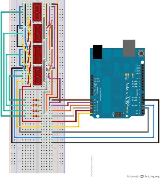 Aunque no se muestra en el esquema, los cables de protoboard muestran un resistor limitador de corriente en serie con cada cátodo común. Aunque múltiples LEDs compartiendo un solo resistor se considera mala práctica de la ingeniería, el propósito es simplemente proteger los SSDs de errores durante el desarrollo. Una vez que el boceto se realiza correctamente, el tiempo de "on" de cada LED es tan corto que el delantero permanece actual dentro de la calificación máxima y las resistencias se puede reemplazar con puentes de alambre para aumentar el brillo de la pantalla.