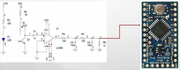 En este proyecto he usado Arduino pro minuto (porque es barato). Como veis en la foto que se tiene que para conectar la salida a uno de los pines analógicos de Arduino.