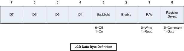 El módulo I2C tiene una serie de 8 bits a registro de cambio paralelo construido en conexión con la pantalla LCD. Las definiciones de bits se muestran en el diagrama anterior. Los cuatro bits superiores conectan a las líneas de cuatro datos superior en la pantalla, al igual que en un típico interfaz de LCD 4 bits. Los cuatro bits inferiores están conectados a varios pines de control en la pantalla LCD. En una LCD normal interfaz estos pines de control cualquiera sería duro con cable (como R/W) o controlar con una línea GPIO en el PIC. El control de contraluz no tendrá algún efecto para muchos módulos LCD porque la retroiluminación es generalmente difícil por cable en.