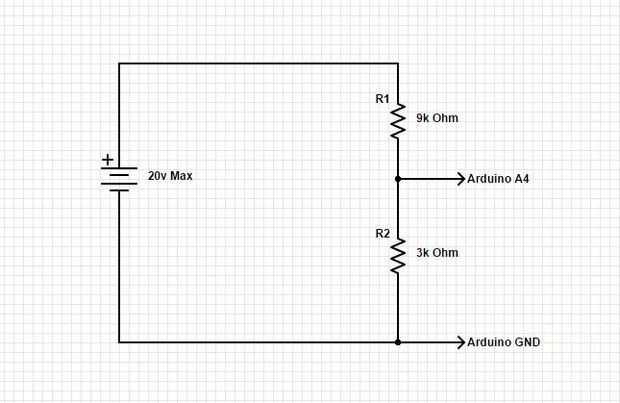 Con un divisor de voltaje con R1 = 30 k Ohm y R2 = 10k ohmios, una batería de 12v se calcula como sigue: