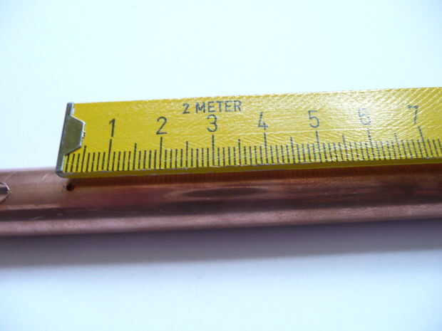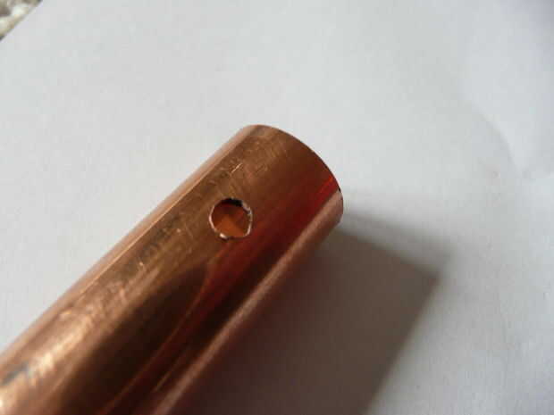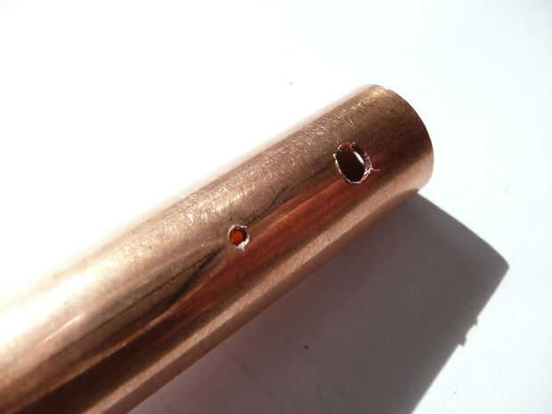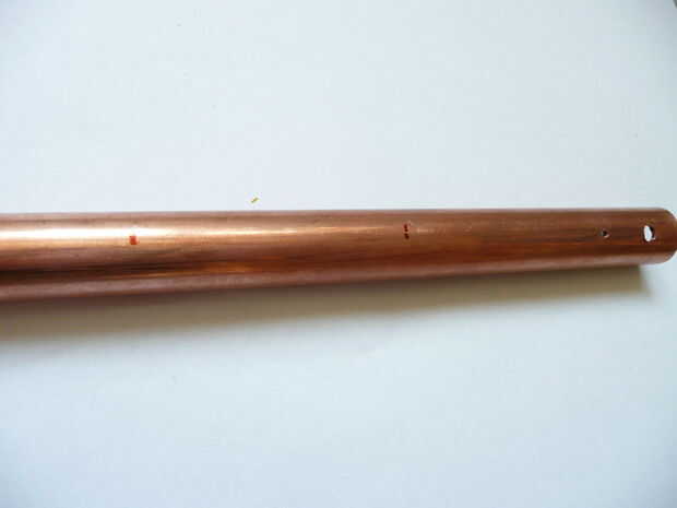 Una vez que ha aserrado la longitud deseada del tubo, puede empezar a taladrar los orificios en el tubo. Empezar por los dos orificios de perforación. Perforé mis agujeros de un centímetro de los dos extremos del tubo.