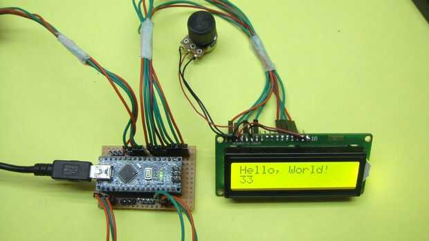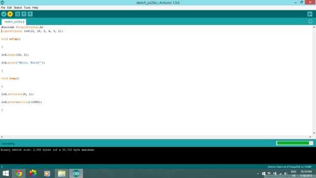 Después de haber conectado el LCD lo coloque en la caja. Montar la olla también. Para el control de la pantalla, cargar el código dado a continuación a su Arduino. Debe mostrar "Hola mundo" con un contador de tiempo después de la carga. Si no aparece nada en la pantalla o muestra cajas negras, probar tu olla y comprobar sus conexiones.