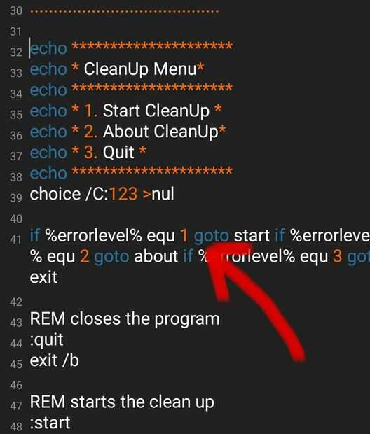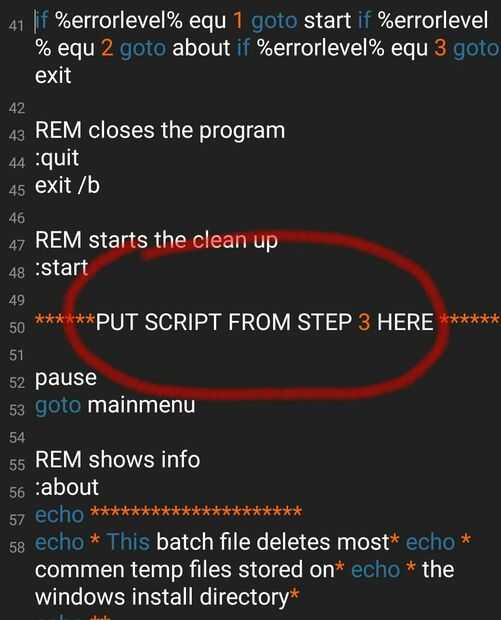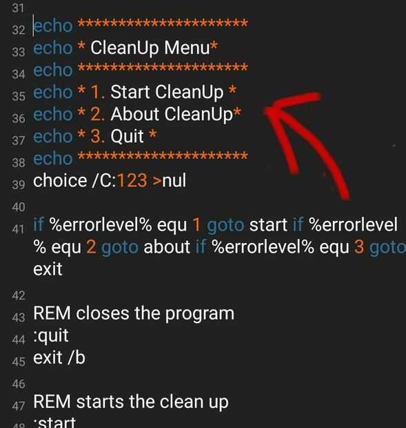 off :mainmenu cls ..................................................,,:+++???????+++:,,.................,~=============~~~~~::::==,............~===============~~~~~:::::,,=...........================~~~~~:::::,,=,..........,:==============~~~~~:::::===...........,,::::=+++======~~~++++=====,...........,,:::::::~~~~~~~~~==========,............::::::::~~~~~~~~~==========.............,:::::::~~~~~~~~==========,.............,:::::::~777777777========,.............,:::::::II777~77777=======,..............,::::::~~77~~~777~=======...............,:::~III~~~~~~~===77====,...............,::::IIII~~~~~~~77777===,................:::IIII~~~~~~~~~7777===.................:::::I+~~~~~~7==77=~==,.................,:::7III777~I777777===,.................,::::III777~777777====,..................:::::~~~~~~=7~=======...................,::::~~~~~~~~~======,...............,,,,,::::~~~~~~~~~======,..............,,,,,,,,,:~~~~~~~~~==,,............................................................................................. echo ********************* echo * CleanUp Menu*echo ********************* echo * 1. Start CleanUp * echo * 2. About CleanUp* echo * 3. Quit * echo ********************* choice /C:123 >nul if %errorlevel% equ 1 goto start if %errorlevel% equ 2 goto about if %errorlevel% equ 3 goto exit REM closes the program:quit exit /b REM starts the clean up:start ******PUT SCRIPT FROM STEP 3 HERE ****** pause goto mainmenu REM shows info:aboutecho *********************echo * This batch file deletes most* echo * commen temp files stored on* echo * the windows install directory*echo **echo * Written by Kevin Tipker*echo * 28/02/2016*pausegoto mainmenu