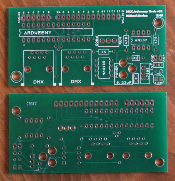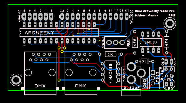 Para ello, he diseñado un receptor DMX de una placa que sirve un tablero de hija Solarbotics Ardweeny. Cuenta con;